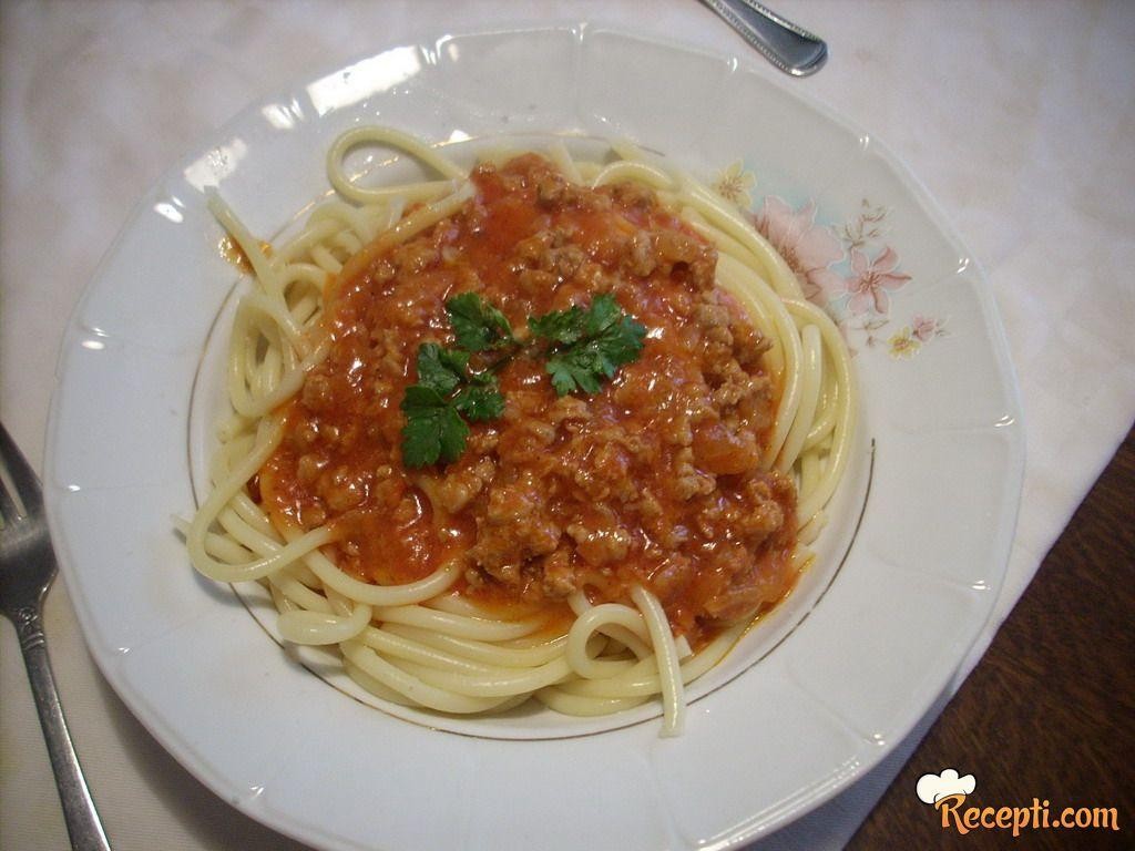 Špageti bolonjez Na ulju popržiti luk. Dodati mljeveno meso i kratko popržiti. Dodati izrezani paradajz i mrkvu. Začiniti. Smanjiti vatru. Uz dolijevanje vode miješati i pirjati dok se meso ne skuha. Kuhanu tjesteninu preliti umakom i posuti parmezanom.